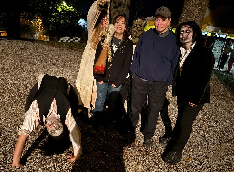 2025’s story had customers serving as investigators for the Southern Indiana Spiritual Society. Our mission? Confirm that the Culbertson family’s home was haunted, and remove the spirits to restore peace to the house. Of course, things didn’t go as planned, and we soon found ourselves having to find a way out of the dark dimension we’d stumbled into – or we’d be trapped there with all the other monsters and lost souls. The entry room truly felt like we’d just walked into an old Victorian mansion, but when we passed through the claustrophobia tunnel that served as a portal to the other side, it was evident something had gone terribly wrong and we were no longer in the living world. We walked through rooms with walls of old portraits and photos, a bloody bath with equally bloody curtains, scenes with caskets and corpses, a blacklit attic in disarray, and a ghastly dinner scene with the bodies of long-deceased people surrounding the table – just to name a few! Downstairs, we were surrounded by stone walls and cells with stone-faced men in suits guarding them. Thankfully, Eric and I find ourselves in places like this often, and we were lucky enough to escape the spirits and exit into the back yard of the Culbertson, where we started.