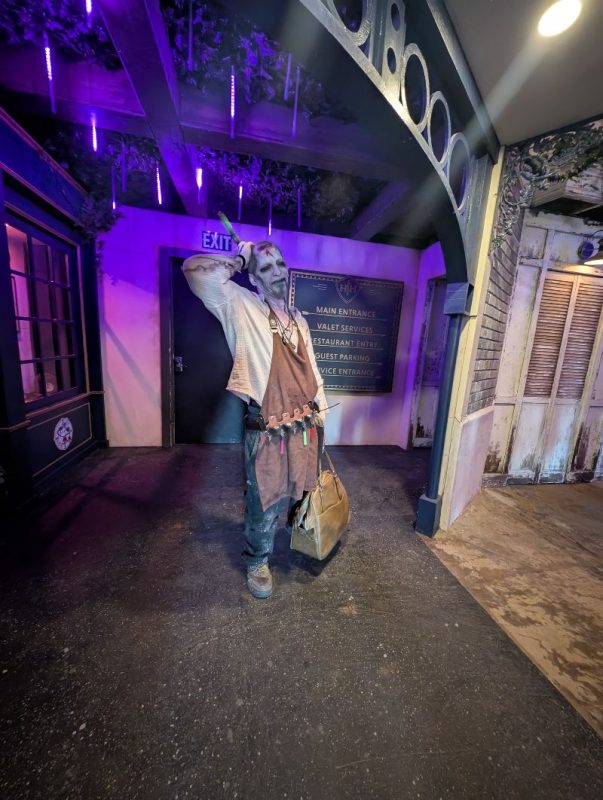 Once exiting the streets of Rue De Lombre, you enter the Lobby of Hotel Descent, where the hotel’s bellhop greets you, and you are sent into the depths below. After making our way back to the surface, we encountered zombies in Eternal Rest Cemetery before stumbling into The Rosecliff Hall. Unfortunately, a significant factor that we couldn’t get past was being able to see above the haunt. Seeing the ceiling rafters and large ceiling fans detracted from the immersion, as did the lack of a soundtrack. The sounds of animatronics and screams from other parts of the haunt were easily audible.