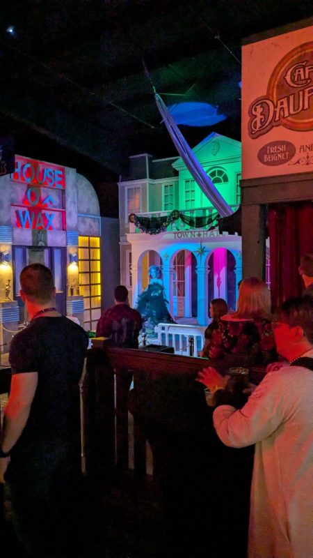 Although there are three attractions within the haunt, Hush has reimagined their haunt. For the first time, all three attractions are united by a single continuous storyline. Rue De Lombre is Hush’s queue scare zone. A Mardi Gras-themed street where monsters roam about: overall, the inside queue area is a fun experience. While waiting in line, each queue actor was a key character from a haunt, giving us a glimpse of what was to come.