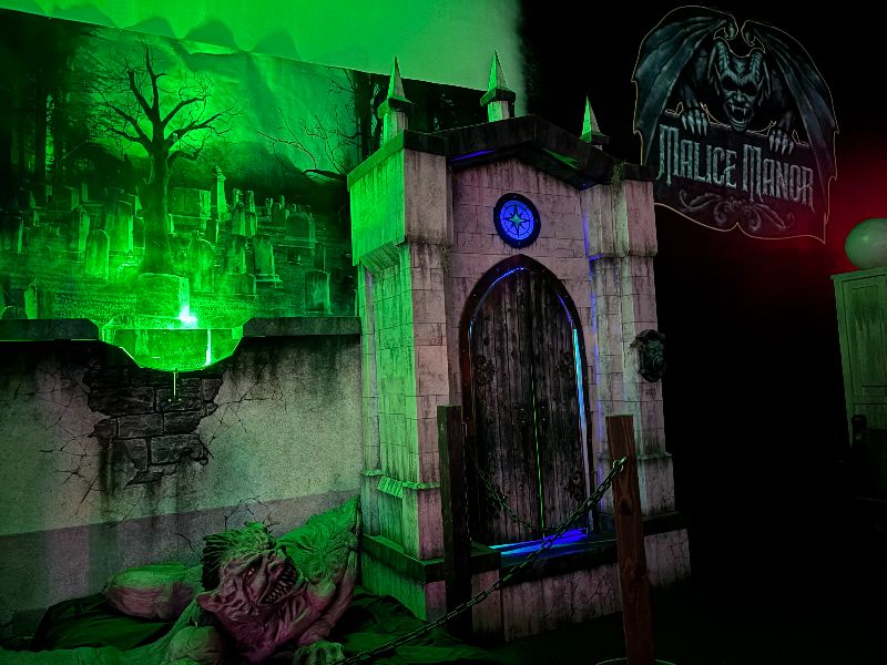 Walking through the packed parking lot on a cool October night, we heard excited haunt goers discussing the terror they experienced within the walls of Malice Manor. One exclaimed to a friend, “Thank you for walking in front of me, I was so scared”, as they both laughed nervously, latching onto one another; beyond the haunt, which is a firm sign of ghoulishly “good” frights to come! This added to our anticipation toward what Lord Rancor and his staff would have in store for us this spooky season.