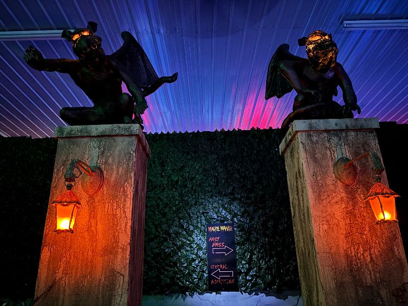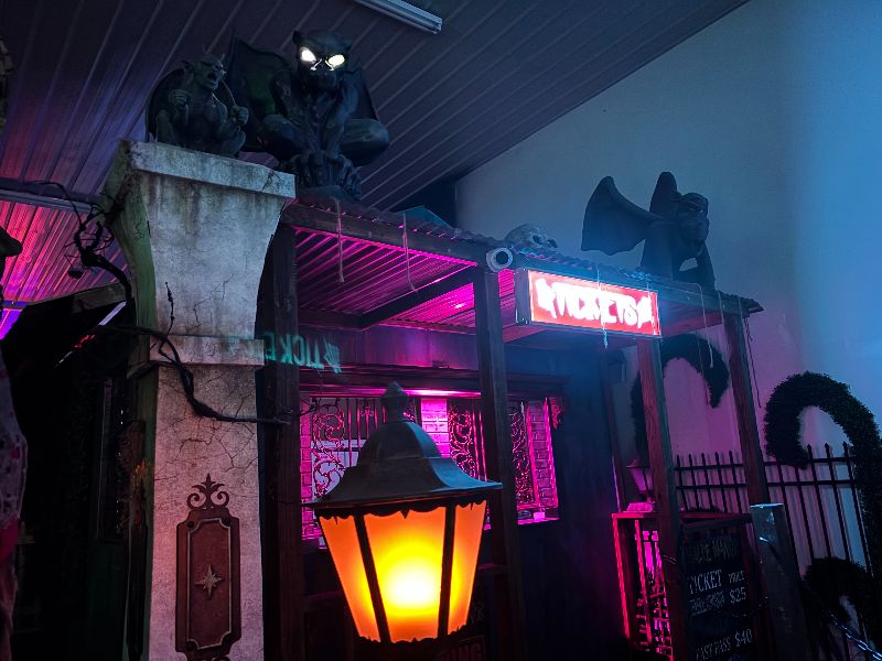 Once we were inside, the ticket booth was immediately to our right and marked with a brightly lit sign. Ticket prices were $25.00 for General Admission or $40.00 for Fast Pass access. The queues for each type of ticket were clearly labeled with arrows guiding groups on which direction to go. Everyone we interacted with at the haunt was pleasant and helpful. The Manor’s website had all of the basics covered, along with some media giving prospective customers a glimpse into their show. We did feel it could use an FAQ section with answers to common questions like touch policy, handicap accessibility, weather policy, etc.