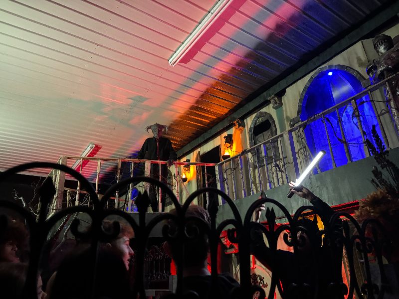 Along the eerily detailed path to the haunt itself, a projected scary movie played on the wall for the crowd’s enjoyment. If you are really…lucky…Lord Rancor will appear above during your wait to…check in. This is a great environment to add to the adrenaline for what’s to come. We caught a glimpse of him ourselves as we waited in line, and his glare sent chills through us. Getting to play with the props, once we presented our tickets, added another layer of immersion. They had all kinds of scary items to threaten one another on our team as we took our group photo. That fun feeling turned to dread as we were guided to the pitch-dark area of the front door entryway to the haunt, and the door slowly creaked open…
