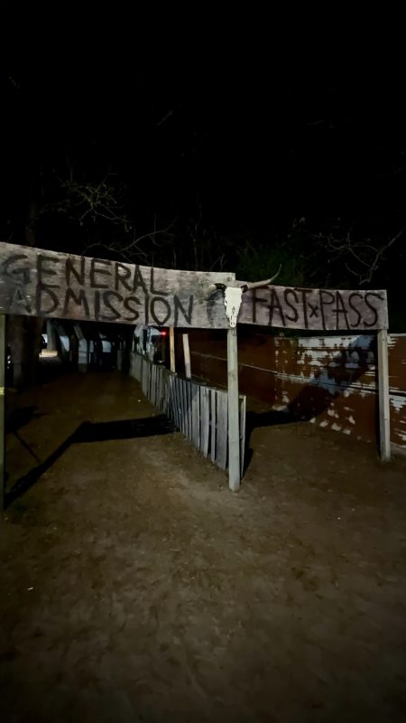 The pre-haunt area immediately set the tone for what was about to come. Jimmy Dean is the ring leader of this Psycho Circus, and he worked the crowd in the queue better than anyone we’ve ever seen. The guy has the energy of a true rock star, commanding attention and keeping everyone hyped while we waited to go in. Adding to the vibe, there was a band playing classic rock from the 70s, 80s, and 90s, which gave the area a fun, chaotic energy and really fit the hillbilly horror theme.