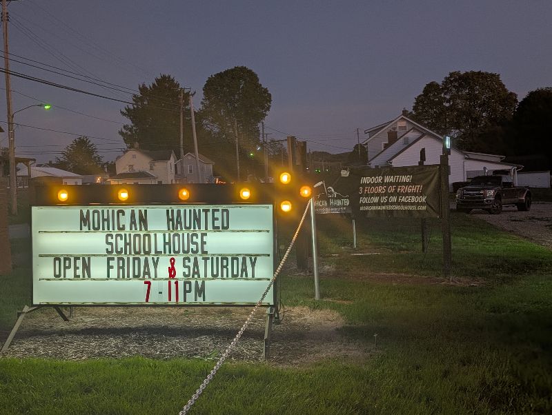 Before our visit, we explored The Mohican Schoolhouse’s website to gather key information such as ticket pricing, hours of operation, and directions. The site was easy to navigate and well-organized, making it simple to find everything we needed before making the trip. Our GPS had no trouble guiding us to the haunt’s location, and as we approached, a large illuminated roadside sign clearly displayed the attraction’s name and operating hours – an immediate indicator that we were in the right place.