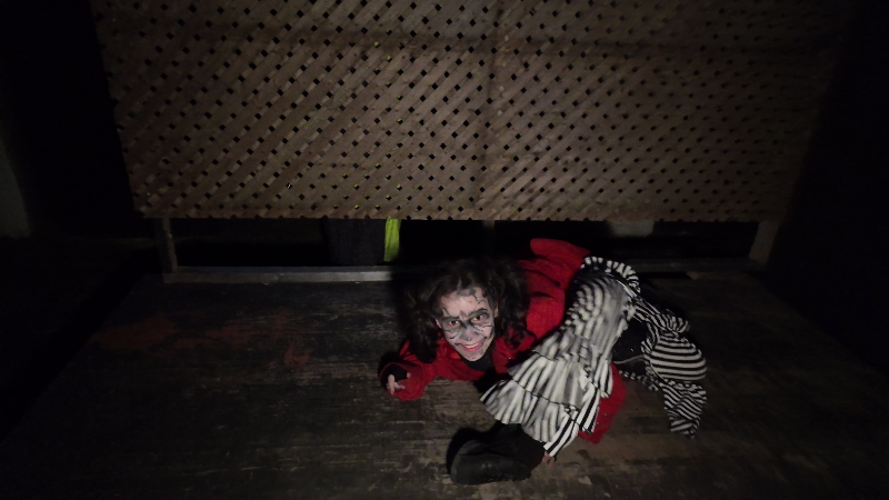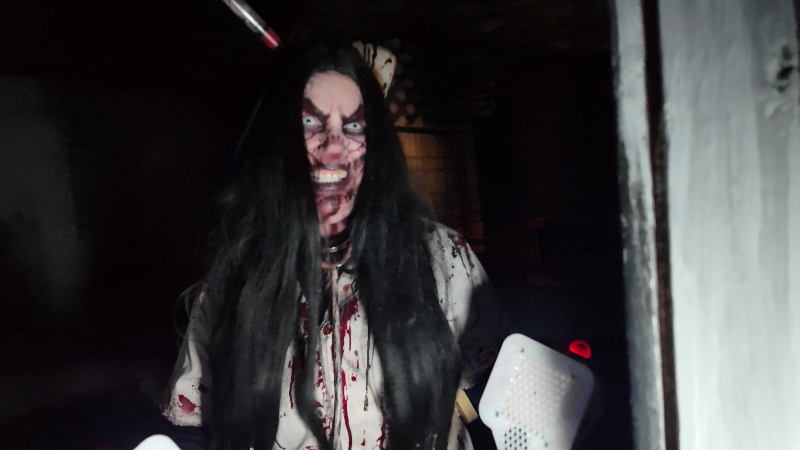 The costumes here are actually really great! The attention to detail in the makeup and clothing was well beyond my expectations. Regarding the clothes, everybody has a costume on, with not a single character looking out of place. My absolute favorite costumes are those of the queue actors. The clown carrying around a fun mystery box of horrible surprises, such as a dead rat, is one of the best-looking characters I’ve ever encountered, let alone the fact that the actor in the costume is clearly having way too much fun with this role. The dirty pinstripe outfit, the mask complete with a little clown hat, it’s all just beautiful. Another of my favorites is the clown? Asylum patient? The one wielding the knife. The costume is simple; it’s just a blood-stained dress and a mask, but it works so well together, and it really fits the psychotic nature of the character.