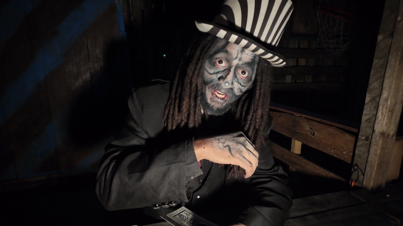Arriving on site, there is a dark walk along a wooded trail before heading up some stairs to the ticket booth and midway. It’s small, but there are people having fun, enjoying the autumn vibes. There’s also a great-looking facade near the entrance to the trail, giving a small taste of what’s to come inside. Heading into the queue, there’s not really any theming to get the juices flowing. Once the show begins, there’s a dramatic departure from the fun fall vibes.