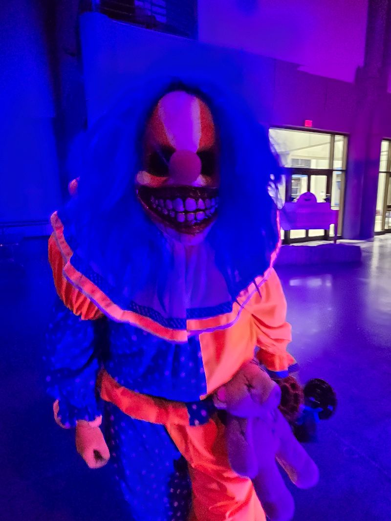 As soon as you step into the exhibition hall, you’re immersed in a haunted party. The overhead lights are dimmed and colored red & blue to help set the spooky party mood. Upbeat instrumental party music is pumping through the sound system, and there is no safe space from the multiple queue line scare actors wandering around. While mostly clowns, they do have a few other creatures that you might see, and one of them is riding a large tricycle around.