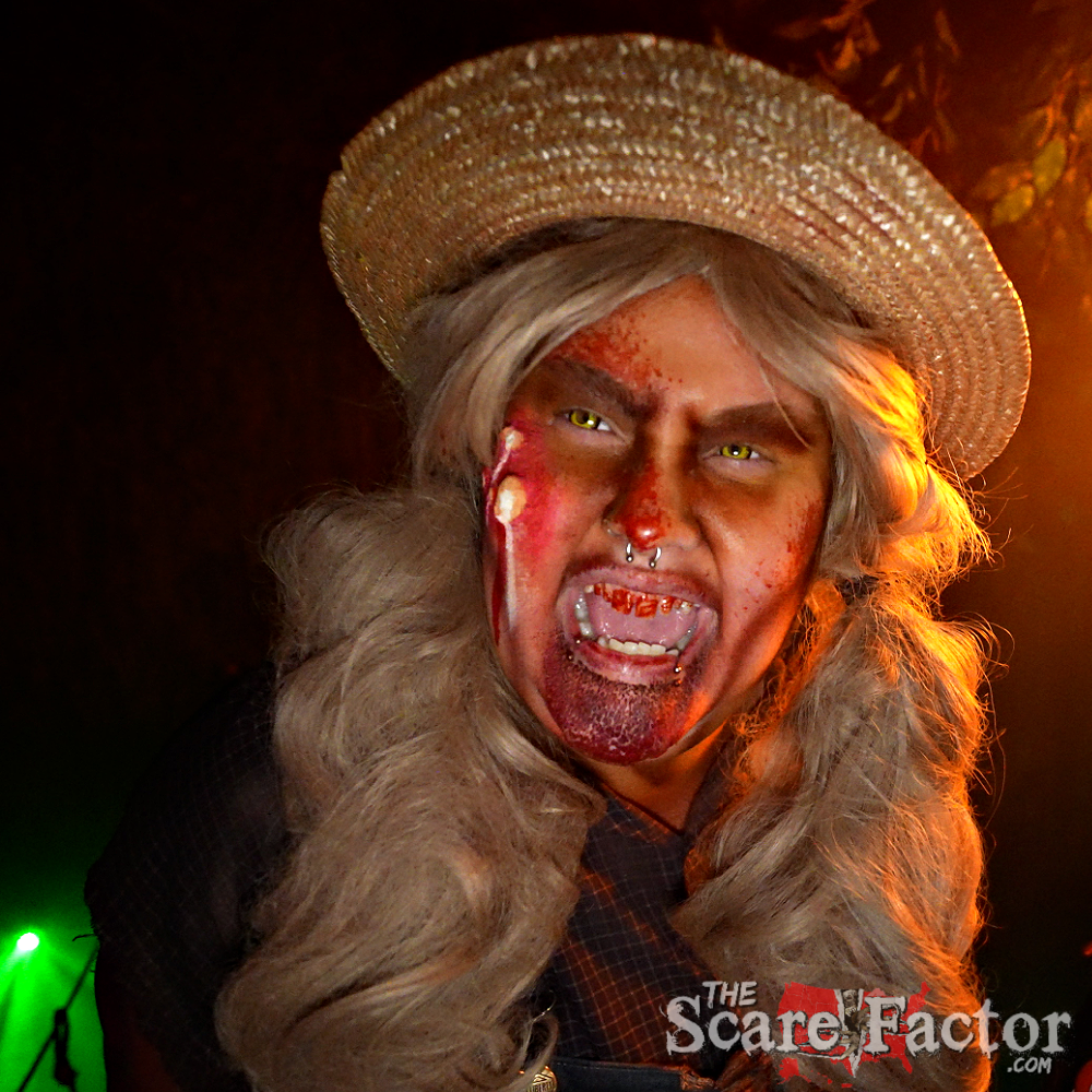 Inside Conley’s farm, characters wore flannel, bib overalls, country dresses, pigtails, and straw hats that fit the setting. Makeup sold the hard-labor look: boils and seeping sores, ground-in dirt, dried blood, and full-body grime. The woman in the freezer had a frostbitten palette with an icy sheen that made her look genuinely chilled. Beyond the shock sticks, performers carried practical farm tools: pitchforks, brooms, shovels, yard rakes, and more. A familiar face, Mama, looked especially rough and ruthless.