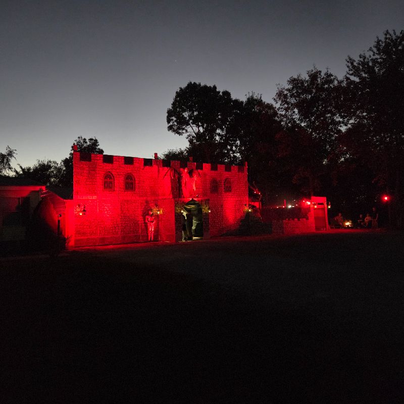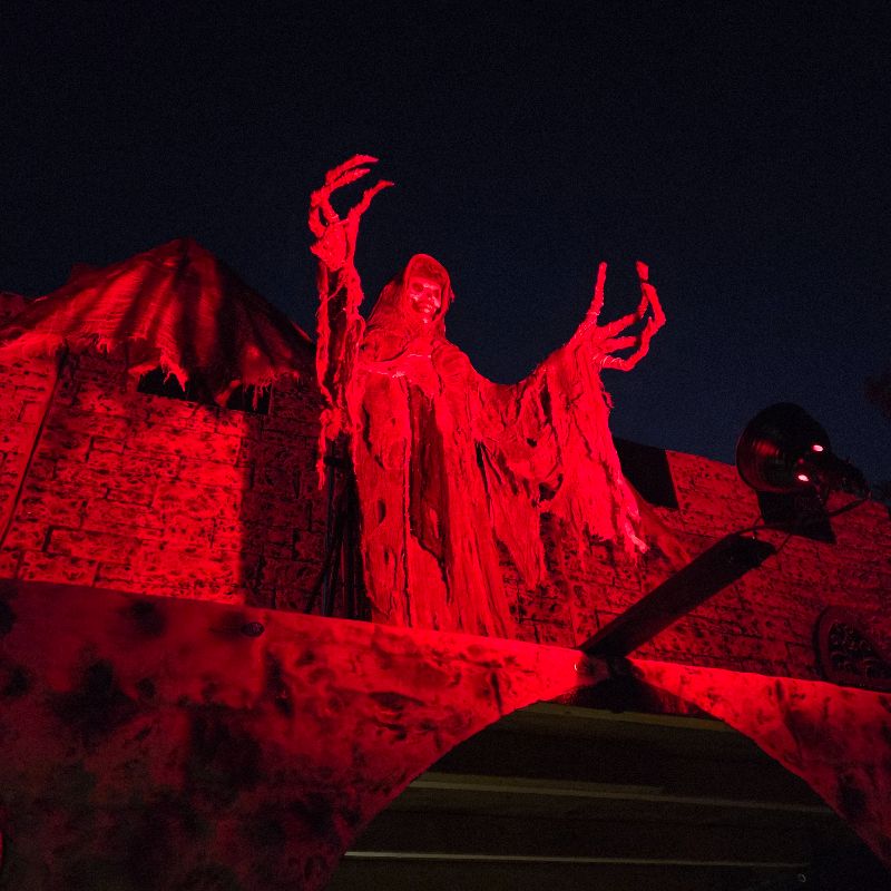 Driving up to a castle for a haunted house isn’t something that we run into a lot. It was a unique experience. The castle was lit up with a red ambiance, and multiple animatronics gave this pre-haunt area a mesmerized vibe. An entire fire-breathing dragon, a larger animatronic, definitely created a specific spooky anticipation. A reaper jumping out over the top of you as you entered to purchase your tickets was a really nice touch.