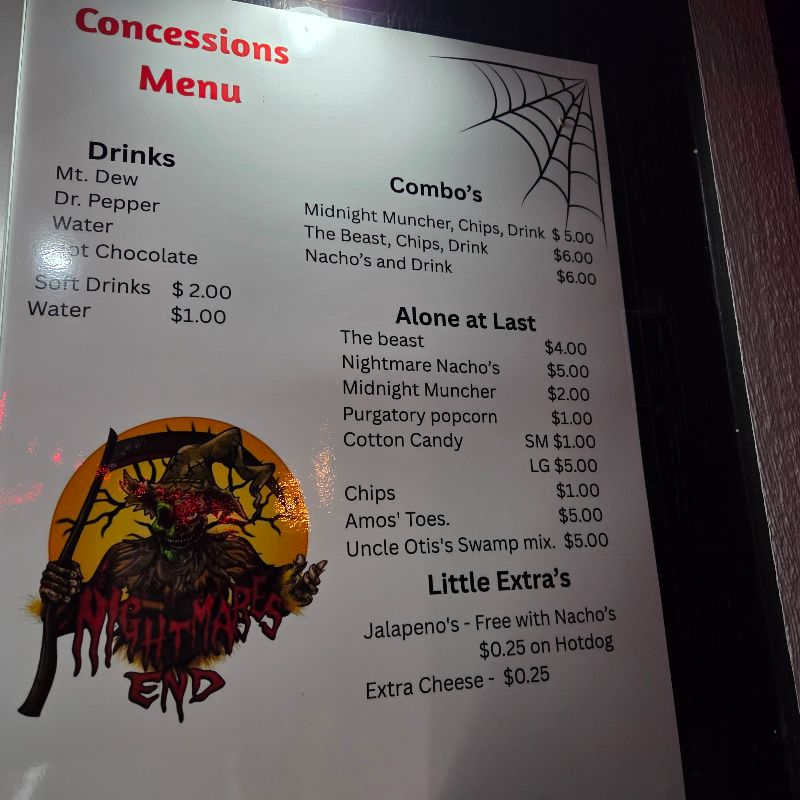 Beyond the main nightmare, there were activities before and after the haunt. Admission included a bonfire, roaming queue actors, and photos with TikTok influencers. Concessions featured The Beast, Nightmare’s Nachos, Midnight Muncher, Purgatory Popcorn, and more. For an extra cost, several games and an escape room, a coffin you must escape, were available. It was infuriating, adrenaline-inducing, and a blast. Highly recommend.