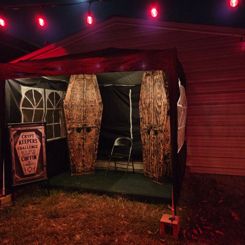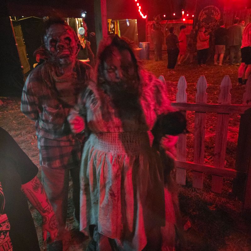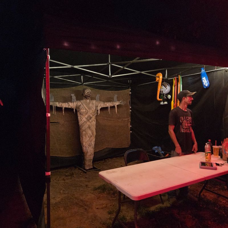 Although not following a specific storyline or theme, once we entered this professional backyard haunt, we encountered many twists and turns and met several actors, some of whom reappeared as different or recurring characters at various points during the walkthrough. While the effectiveness of these actors’ scares remained strong, their repeated reappearances in new scenes sometimes pulled our attention away from the immersive details of the surroundings. Once the walkthrough was over, we shot back out into the pre-haunt area, where there were some games, concessions, and an escape room that kept the fun going as we weren’t ready for it to be over yet. That escape room was truly something else.