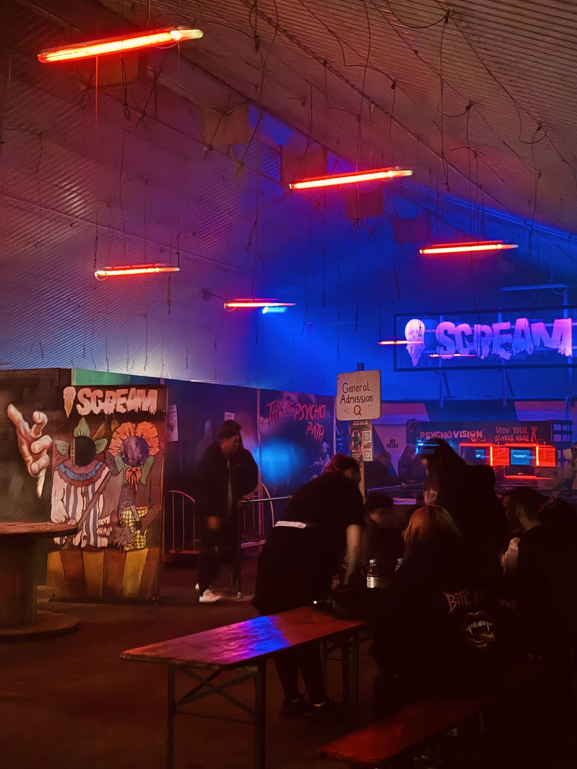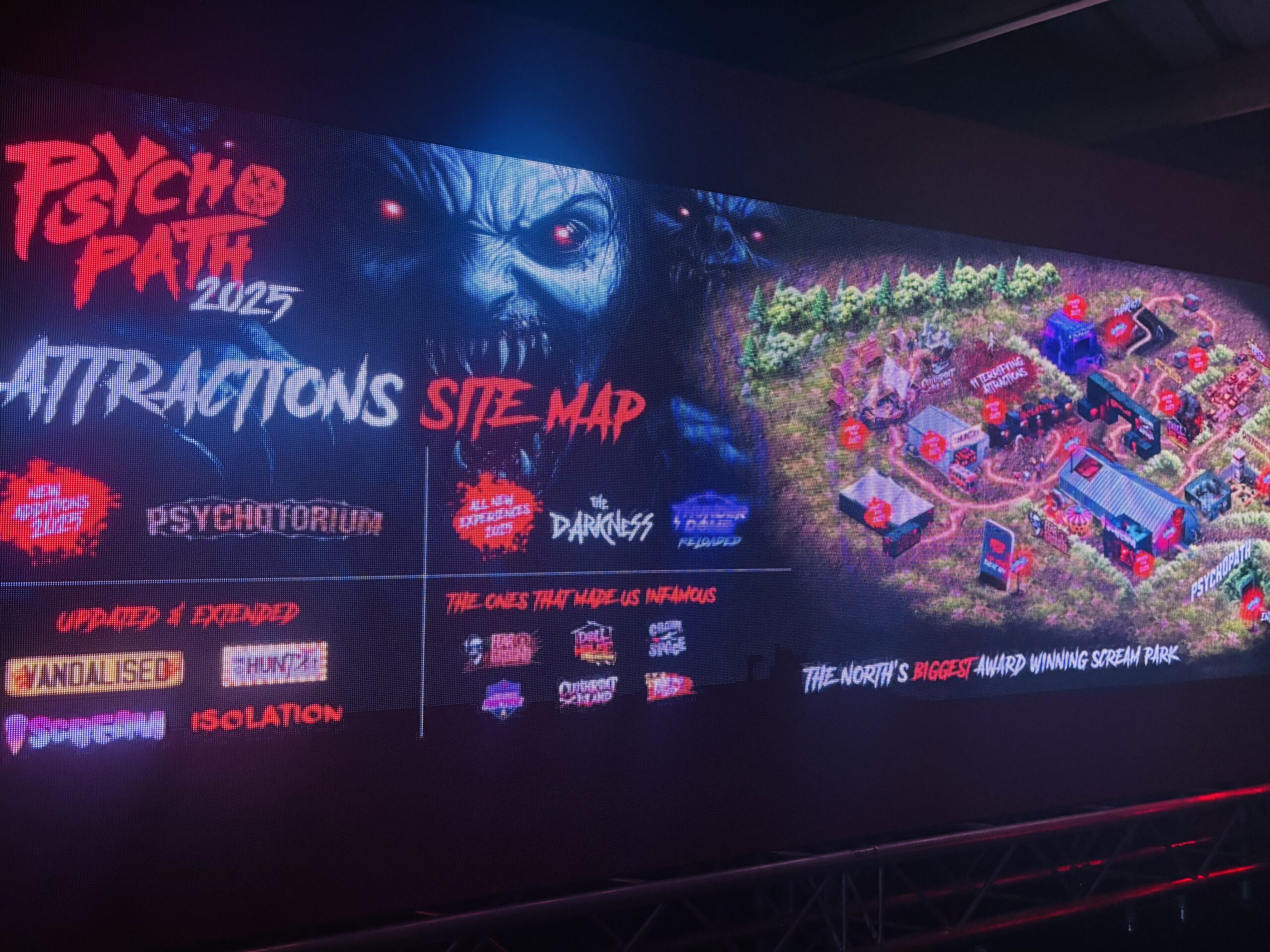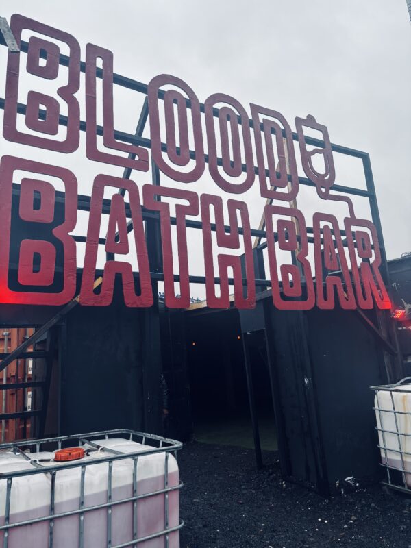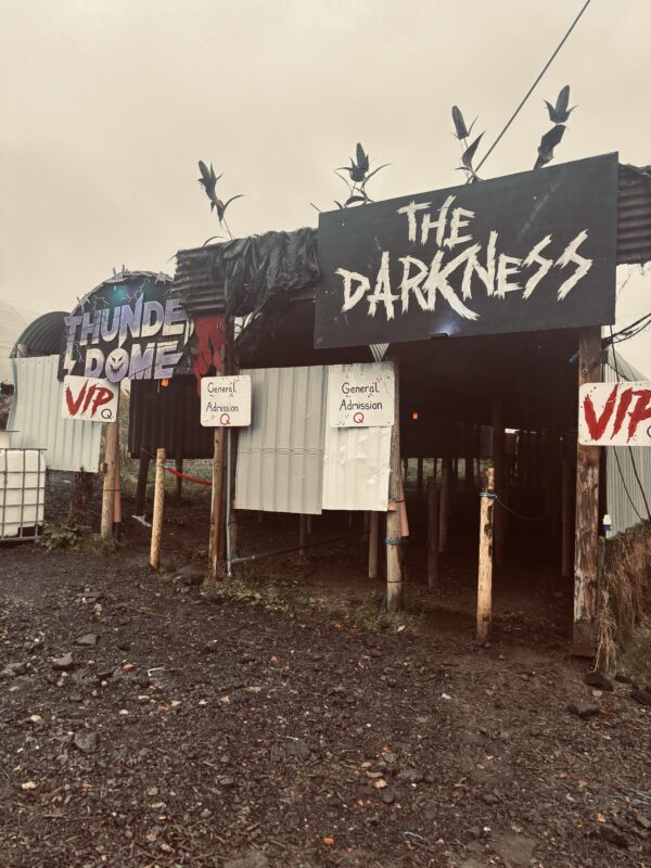 We were very impressed by how Psycho Path took such a vast site and made it easy to navigate and enjoy, all whilst providing kind and friendly service. The entrance to the park has excellent signage and good lighting, meaning that we had no trouble locating it. Once inside, the park expands from a central covered hub full of music and entertainment, and periodic maps are displayed on screens to help you find your way. If you are ever lost, members of staff are always there to show you the way, whether as a regular park worker, or a costumed cast member. In this way, Psycho Path really stands out. The cast on the doors of the haunts know their way around and will tell you in character where you need to go. They really know their stuff and will be able to point you in the right direction, albeit evocatively.