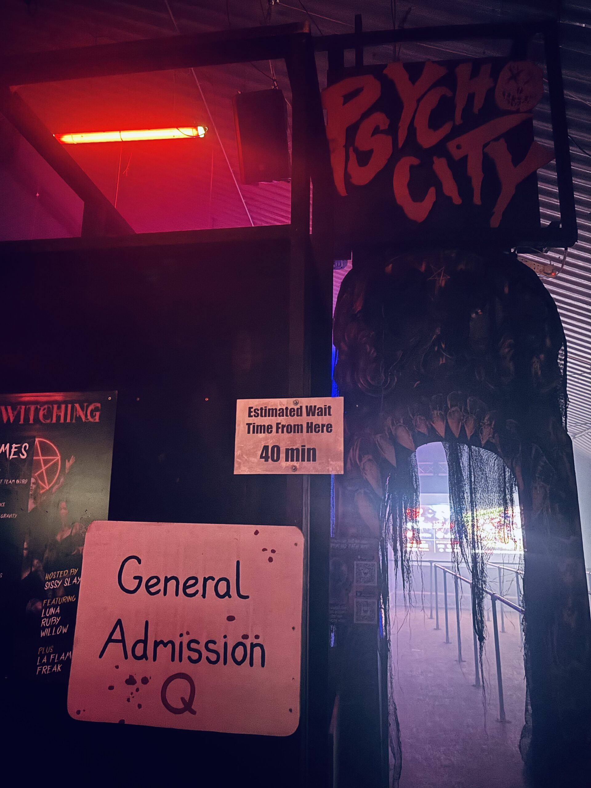Psycho Path haunts traverse the line between scare maze and immersive experience, leaning heavily into theatrical vignettes instead of just jumping out from crevices with guttural screams. Don’t get us wrong, they do that too, but there’s a heightened level of presence and interaction between them and their audiences. Highlights of the night were the cast from both “Psychotorium” and “Crawl Space”, who weren’t afraid to get up front and personal with us. We had one-to-one interactions with characters in these mazes and others, some forcing us into corners and others even licking our glasses. The family at “Crawl Space” are some of our favourites, with Monnika (one of the sisters) leading the charge at the ticket booth at the front. And in all of these, we had actual conversations with innumerable characters – the improv talent of this cast was impeccable!