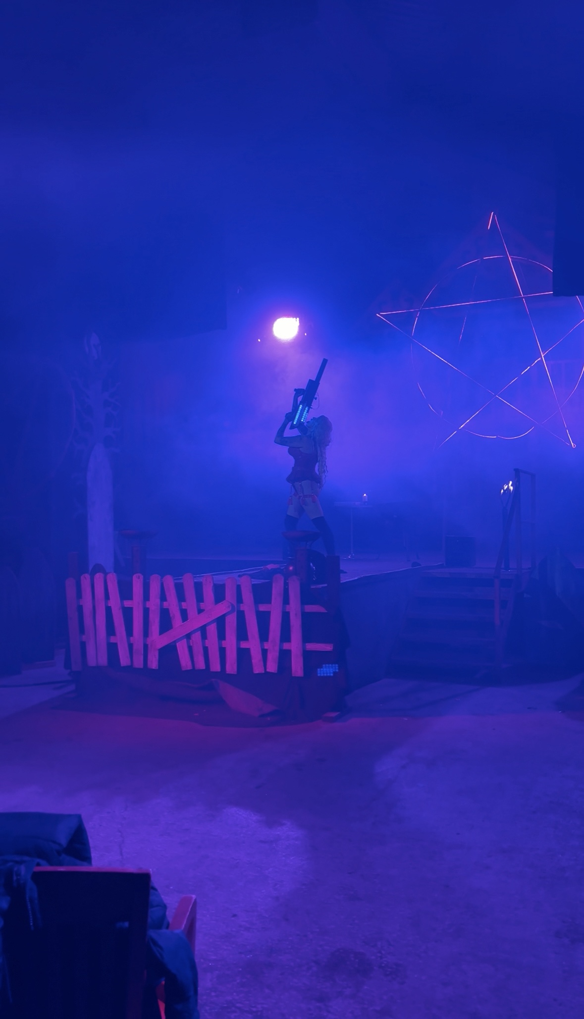The newest haunt, “Psychotorium”, included sets that travelled the whole prison experience, from a phone call with your lawyer at the beginning via an old rotary device, to the prison exercise yard, and all the way to the electric chair, and inevitable crematorium. Each of these spaces was fantastically constructed, and that you had to interact with some of them, such as the phone and lying down in the crematorium, was an unexpected bonus. Small spaces are manifold, but we were in awe with the use of pyrotechnics and electric shocks (painful!), the former of which would presumably have to be reset for each group – superb! Other effects included air blasts and climbing through a “wall” with a rope.