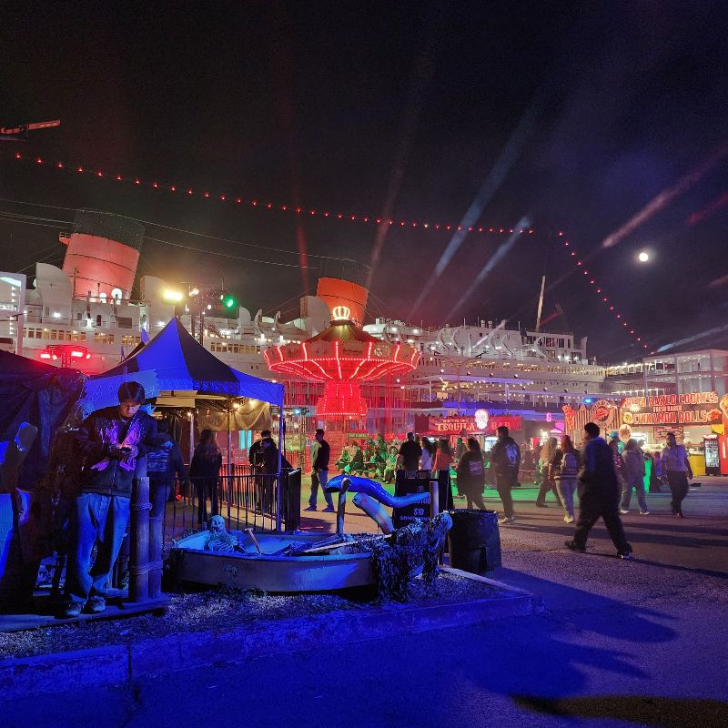 This attraction was reviewed by Team Zombillies, Team Living Dead Duo, Team Lone Wolf, and Scream Scout Vampiress on October 8, 2025.Anchored in Long Beach, California, the historic Queen Mary transforms into SoCal’s ultimate Halloween festival – a floating fortress of fear where everything you need for a night of thrills is in one place! Step aboard and you’ll find haunted mazes, themed bars, eerie lounges, carnival rides, creepy games, festive eats, chilling drinks, and enough photo ops to sink a smartphone!