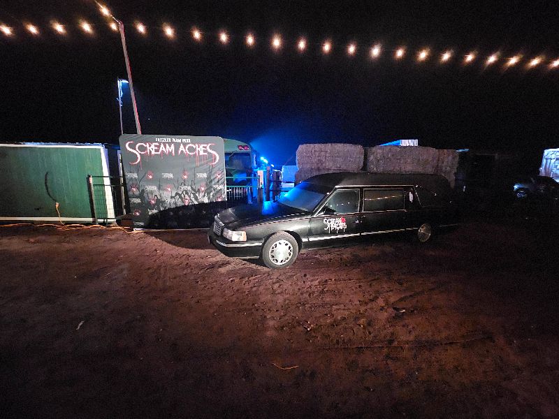 As guests approach the Fritzler Farm Park, with the crisp feel of autumn in the air and the sound of the pumpkin cannons blasting in the distance, it’s clear something special is happening on the grounds. Walking in from the parking lot reveals fields of pumpkins waiting to be picked off of the vine, which are sold by the pound, and tents and tables on both sides of the entry queue line. Going through the gate, the farm park comes into full view. Games, photo ops, and other attractions line both sides, with a central circle of food trucks sitting in the middle, offering a wide variety of fare ranging from tacos and sushi (from the same truck nonetheless) to burgers to chicken and waffles. Beer and other liquid spirits are available to those over 21, and Frankenfuel energy drinks are available to those of us in need of a jolt. All of those sights and sounds come together to create an incredible vibe before ever entering the haunt. While that atmosphere is much more jovial than that created behind Scream Acres’s wooden gates, it sets the scene incredibly well. Once darkness falls and the haunt’s gates open, the vibe in the queue line is much more sinister, matching the mood of the haunt. Music blasts through the crowd and the queue cast cascades through the line bringing screams to some and posing for photos with others. A pair of themed vehicles adorn the line, which also offers porta-potties and a drink stand to make the wait more tolerable. On select nights throughout the season, there are also other offerings, ranging from fire dancers to fireworks. This sordid scene culminates at the haunt entrance, where the vibe is utterly electric and guests are gathered before being sent off into corn.