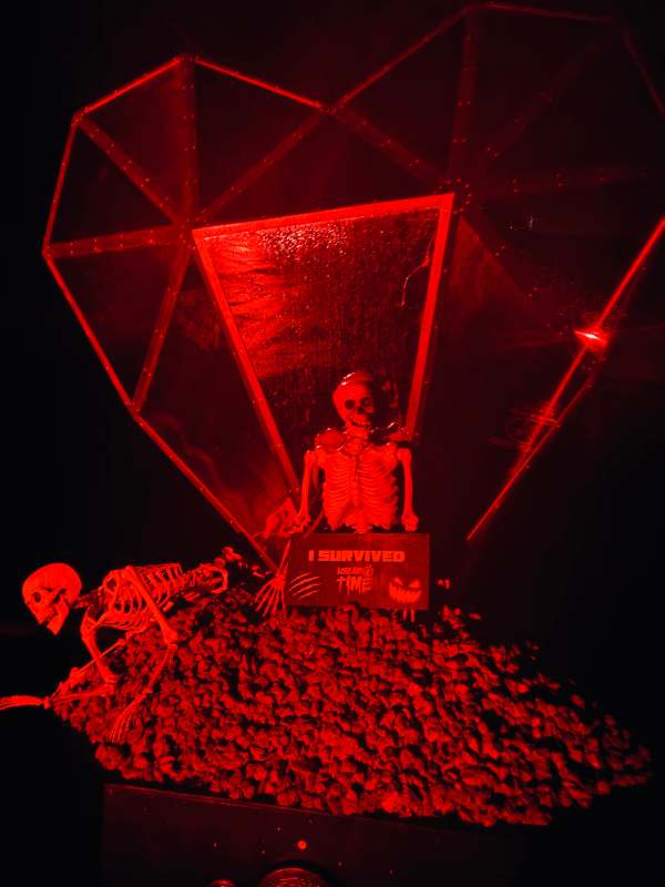 The scenic elements were also engaging, with striking visuals such as skeletons crawling up the staircases inside the castle’s grand Gothic hall and giant play blocks in the playroom that spelled out “PLAY DEAD.” Throughout the trail, mannequins were positioned so realistically that it was often difficult to tell which might suddenly walk from their plinths. This uncertainty added a constant sense of stress. We cannot overstate how magnificently the lighting played off the location and scenery, with vast windows flashing red on the exterior of the castle luridly beckoning us forward in an almost filmic fashion.
