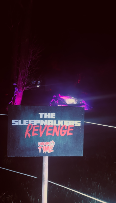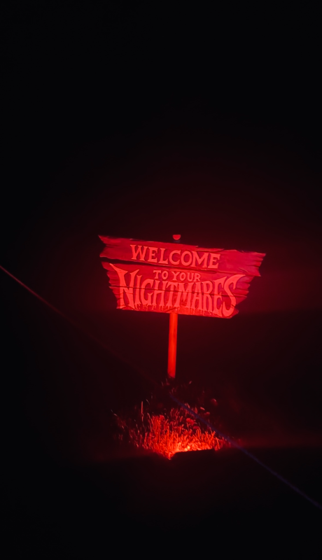 The pre-haunt area was lit beautifully, making excellent use of the castle’s Gothic design. Purple and red lights glowed upward through the stately archways, creating an atmosphere that was both elegant and sinister. This area also featured a roaming actor with disconcertingly long fingers and an enthralling fire dancer, along with some delightfully creepy Screamtime signage that set the mood superbly.