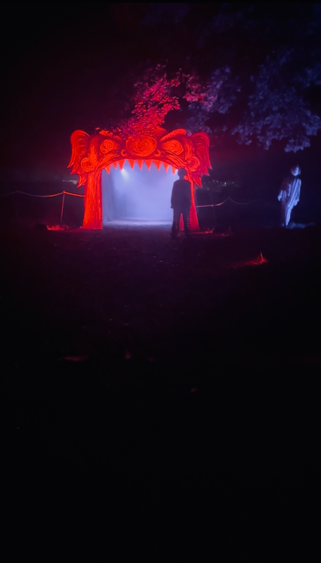 The trail is divided into two main segments. You begin with the first half of the stroll, followed by a midway entertainment area featuring fairground rides, marshmallow roasting, drinks, and other fun activities. After spending time there, visitors continue the trail at their own pace through the castle itself before returning to the midway area and then descending down the final path. It is a distinctive setup that offers a nice balance between scares and relaxation.