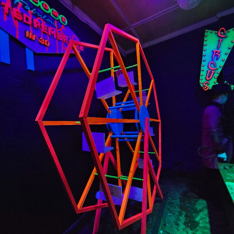Throughout the maze and all the twists, turns, and games this circus put on, the neon colors, cast, and scenery kept us mostly immersed. We were trying so hard to find which way to go and being distracted by the cast that during our 3D experience, we remained disoriented, overstimulated, and overwhelmed in the best kind of ways. However, when it was time to put the glasses up and embrace the haunted school vibe, it was a bit hard for us to adjust. As we walked out of the school, we felt more anticipation and less immersion.
