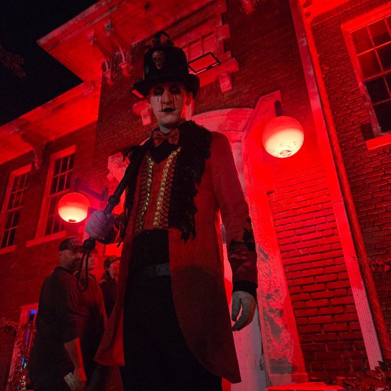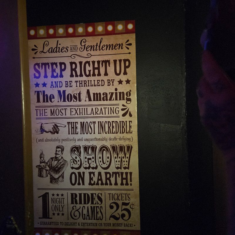 The ringmaster and a clown riding around on a bike were the two cast members that we would consider queue actors. The clown’s mask and costume were not quite as complete as the ringmaster’s, who was fully dressed in a red cape, a top hat, colored contacts, and full black around the eyes!