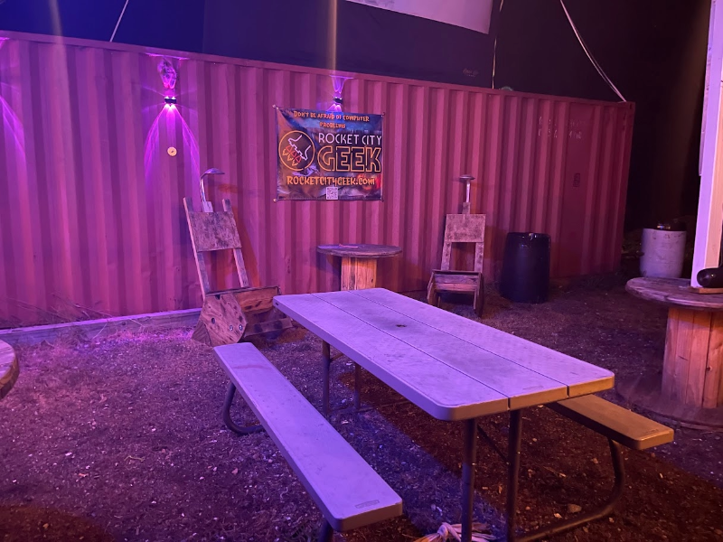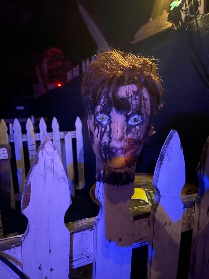 Once we entered, we found the ticket area. It’s a table right inside the entrance, adorned with bloody hanging heads. It is obvious that this is the ticket area, even though there aren’t signs to indicate so. An animated Jack-O-Lantern greets guests at the entrance of the queue line, which is easy to find. There are picnic tables where you can hang out and check your shoelaces before entering the haunt.