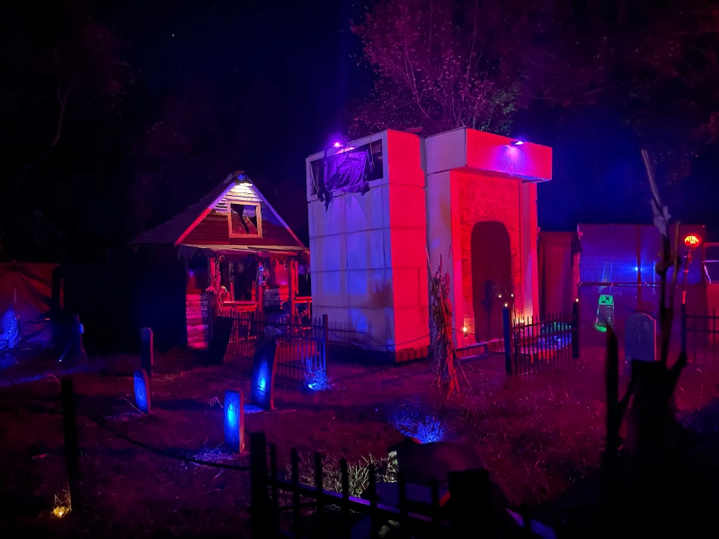 The entrance and midway areas were well-lit and mindful of safety precautions. Inside, there were a couple of areas that made me glad I checked my shoelaces. There was a concern with the lighting in the graveyard, which shone in our line of sight. This made it difficult to see a roped area around some tombstones and a pointed step on the pathway to the next scene. Another area of concern was unpadded obstacles (head-knockers) in darkened areas. We won’t tell you how we found this one.