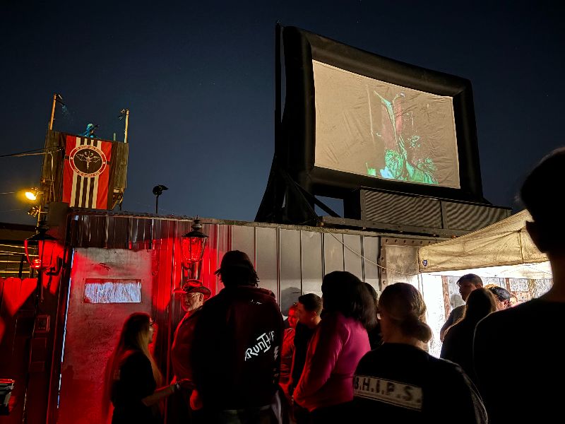 Shortly after getting my ticket and walking through the front gate- where banners displayed the haunt’s name and flags bearing the Bracken-Hart insignia waved in the breeze- I was swiftly pulled into the world of the Horrorplex. Several stray patients and doctors prowled the line, scaring and entertaining groups. Many podiums were positioned throughout the queue, allowing customers to brush up on AHP’s backstory while they waited. Projections on a screen above the line also played clips relevant to the story, and music played in the background to keep people entertained.