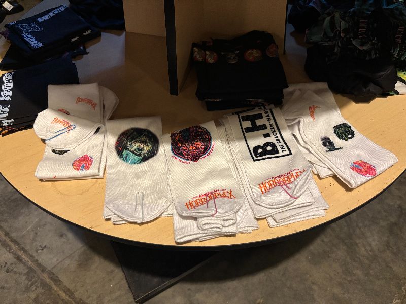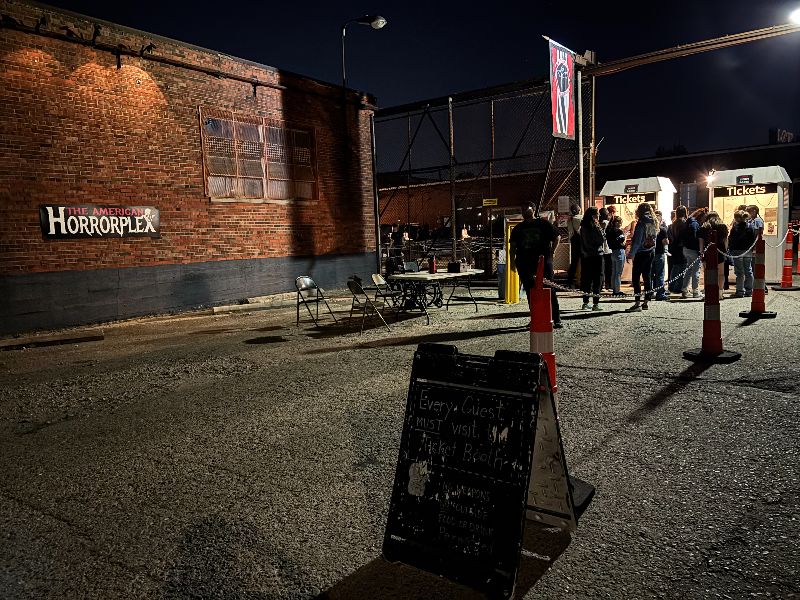 Finding American Horrorplex was super easy. Before I even reached the haunt, a brightly lit sign reading “HAUNTED HOUSE” at an intersection let me know I was headed the right way! A parking crew was waiting for arriving cars outside, and the building was lit up in various colors. Parking was free; their small lot was full when I got there, but the crew found me a nice spot on the street. Upon getting out of my car and walking to the front gate, a banner confirmed I was at the right place, and the ticket booths were clearly labeled. Ticket prices were as follows: $26.00 for General Admission, $46 for VIP (included a $5 credit for stuff in the midway), and $66 for Front of the Line (also included a $5 credit). Each line was labeled for its corresponding ticket, and plenty of friendly staff were around to help as well.