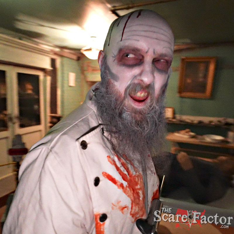 Characters of the Morgue were adorned in blood and death, which was very frightening, not at all demure. Dr. Vanderdark appeared to be in an aggressive stage of decomposition himself, with gray skin, circles of blood around his eyes, and blood running from the center of his head, down the sides of his face. His light gown with bloodied handprints all over gave off the appearance that he had put those black gloves of his to good use.