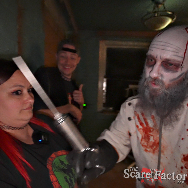 A pale, agitated man with dark circles under his eyes and blood dripping from his head appeared suddenly in the first room, introducing himself as Dr. Vanderdark. Dressed in a long white coat, black gloves, and clutching a massive syringe, he made it clear we were merely his guests, and non-compliance would result in being embalmed alive. No, thank you! His chilling performance set the tone for the horrors that awaited us. He instructed us to knock on a door, but he shouldn’t be trusted!