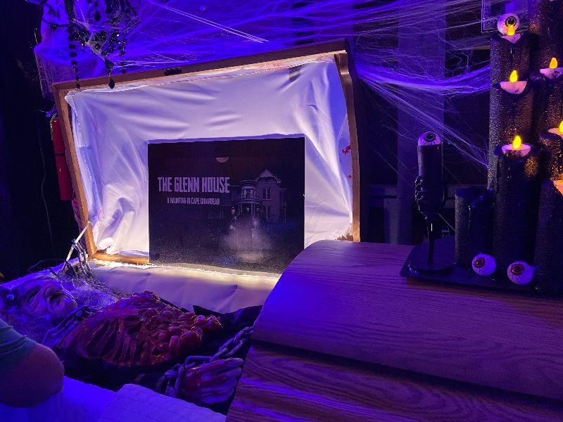 When we pulled into the parking lot, it was not easily noticeable that we were at a haunted house, except for the sign on the building. However, once we got inside, where the ticket booth was, it immediately gave us spooky vibes. The queue is located outside next to the building, and they had a Halloween movie playing on a TV, as well as music playing on the overhead speakers.