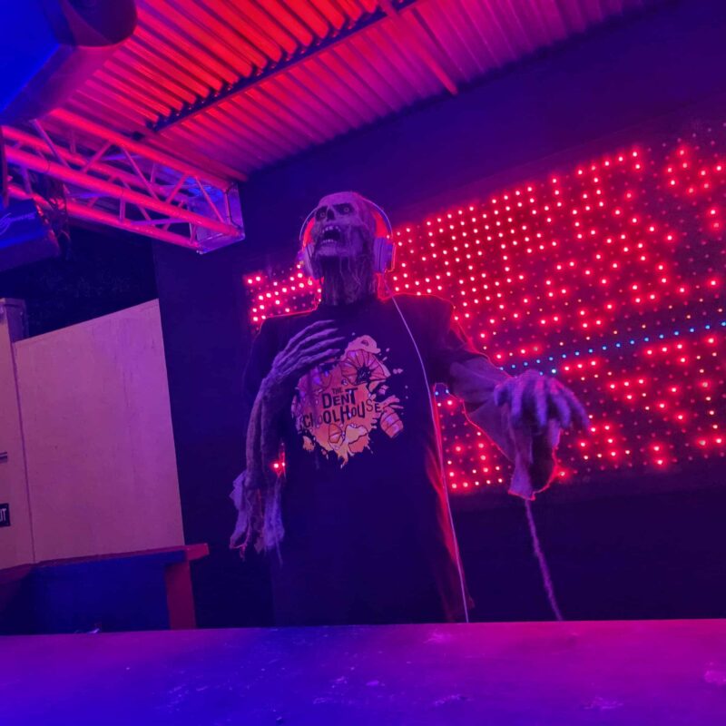 From the moment we set foot on the property, one thing was immediately obvious: we had better be ready for class… because school was IN! Boarded-up windows and a real bus parked outside enhanced the illusion that we’d just arrived at an actual haunted school. Some of Dent’s iconic characters- like Zobo the Clown and their new character TricksE- roamed the grounds, simultaneously tormenting and interacting with arriving groups. Dent-themed clips played on a projector to entertain the line. There was also a highly detailed Fall Festival area for customers to explore and wait in before entering the main house.