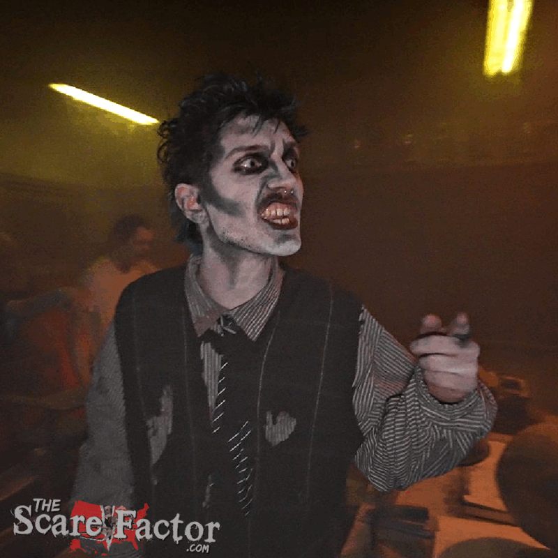 Dent operates as a “Conga Line” style haunt, meaning guests navigate its eerie halls in steady groups. As a result, most encounters consist of sharp, high-impact jump scares. Performers burst from behind chalkboards, claw through bookshelves, slide from sewage vents, scale the walls, and even leap from the rafters. These quick scares are punctuated with clever dialogue, making them both startling and memorable.