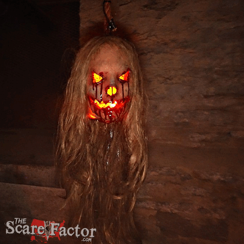 Some special effects were unique to the Schoolhouse. One of our favorites was the wall of student portraits that suddenly animated, the children cowering away and whimpering in fear as slash marks appeared and rivulets of blood ran over them. Other school-themed additions included animatronics of students getting paddled by a teacher or repeatedly ramming their bloody face into a pencil on a desk (ouch!). Something we noticed quickly was that Charlie seemed to have an affinity for Halloween… as evidenced by his creative use of severed heads as makeshift jack o’lanterns! The majority of the haunt’s rooms were heavy on props, with most very appropriate for their respective scene or area; there wasn’t much that left us scratching our heads and wondering, “Why is that there?” Several bodies of students and staff were hung up with evidence of being tortured or long-deceased, though a few appeared to be fresh and still in their death throes. Lots of clowns resided in the carnival, both static and animated. Dr. Dent’s secret laboratory contained test tubes with his latest experiments.
