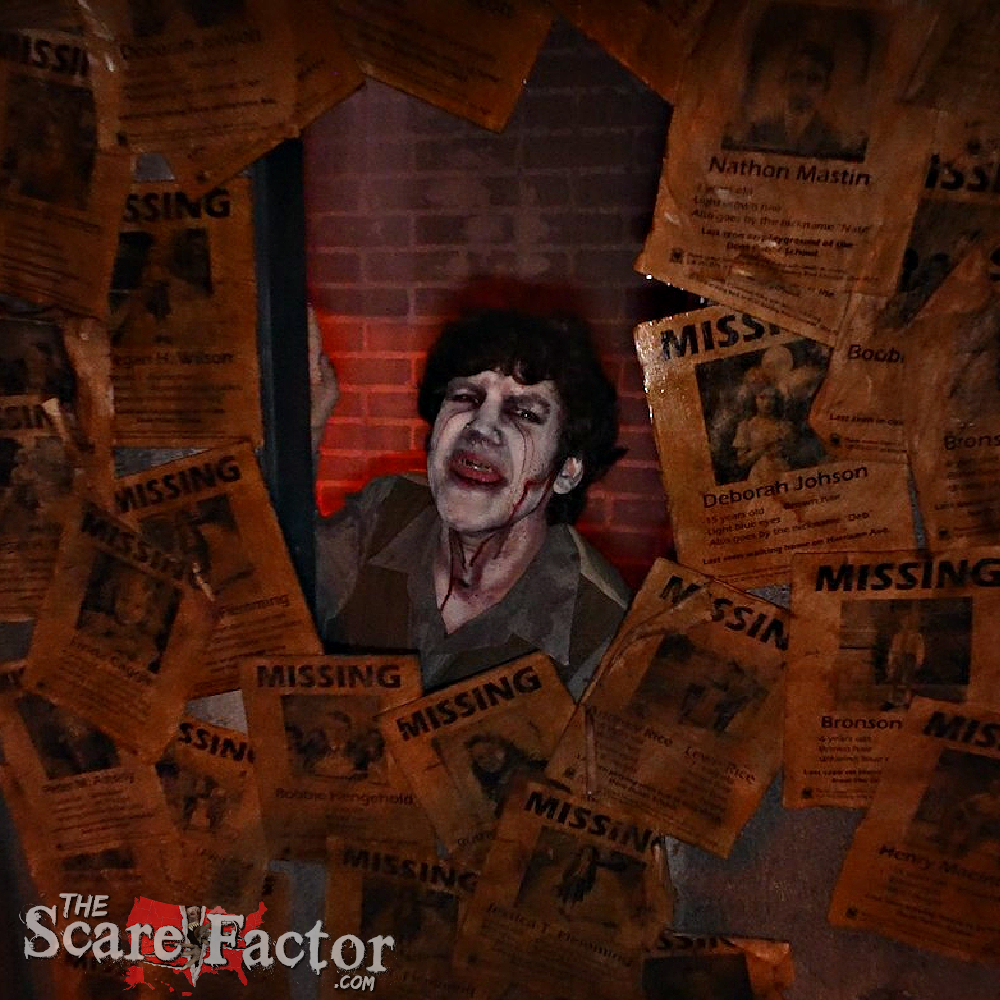 Dent pulled out all the stops to create a full-blown immersive experience, from the background audio in each portion of the house to the many props, animatronics, and special effects included in their scenes. As soon as we stepped through the front door, the bell rang to let everyone know class was now in session! Additional audio included the creaks and groans of an aged building, a radio playing reports of missing students, cheery circus music, and anxiety-inducing background music in the finale that only intensified the closer we got to our doom. While we did walk through some darker spots meant to build suspense and prep customers for scares, lighting was used to great effect in the rest of the haunt. Layering was abundant: pretty much every wall had some sort of texture going on, and we noticed plenty of posters, desks littered with papers, dust coated multiple surfaces, and cobwebs glistened from flickering overhead lights.
