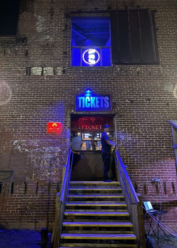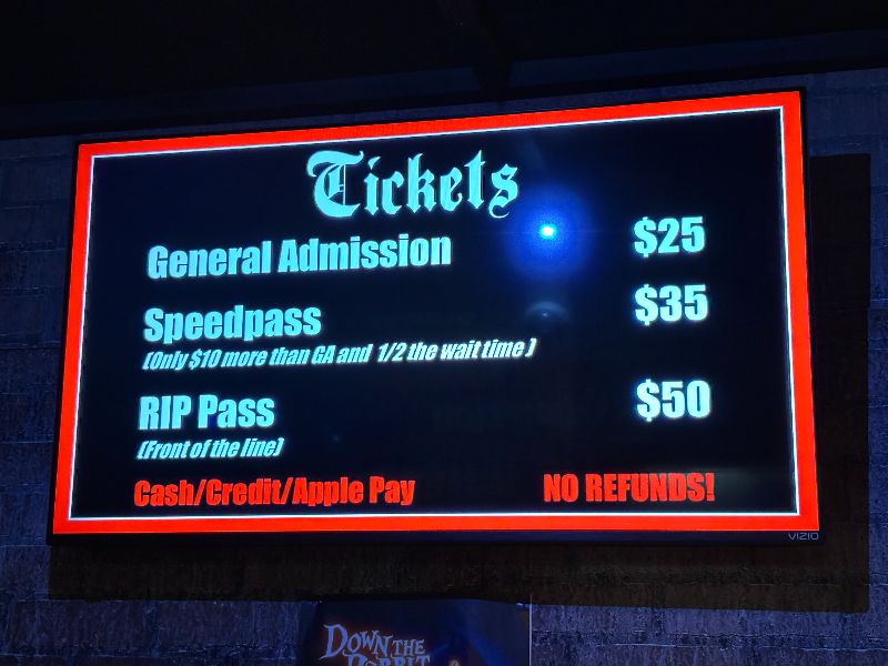 Finding The Devil’s Attic was quite easy. There’s a banner hanging on the front side of the building if you’re approaching from the intersection, and on the other side a sign reading the haunt’s name sits above the front door, lit up in red and purple. Parking is free, and a parking team was on hand to guide arriving cars to available spots. The ticket booth was clearly marked. Ticket prices were $25.00 for General Admission, $35.00 for Speedpass, or $50.00 for the RIP Pass, the last of which is a newer offering that takes a customer straight to the door with no wait. Their parking lot was well-lit, and they had a visible security presence to ensure safety. Both ticket lines were also clearly labeled, and plenty of staff members were around in case anyone needed assistance.
