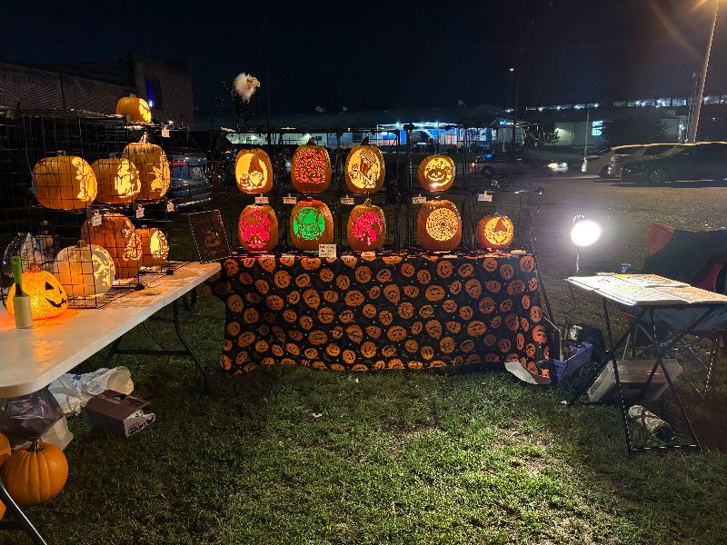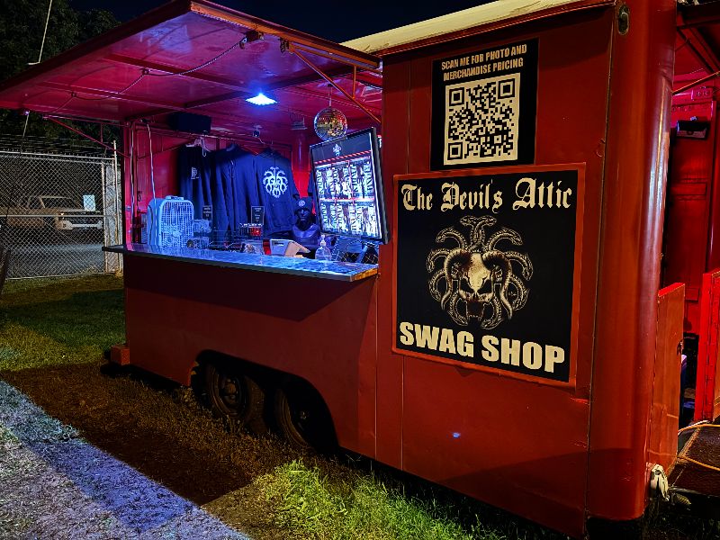 An almost infernal red glow was cast over much of the building outside; a hint to the journey through Hell I was about to begin. Rock music played and a movie was projected on a screen to keep the line occupied, while two roaming monsters- Orlock and Scarecrow- entertained and scared waiting groups. The haunt exited towards a merch trailer where people could purchase their souvenir photos, t-shirts, and other goodies. Tricked Out Pumpkins and Skarekro Art were both set up as vendors on the night of my visit.
