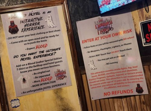 Spooky sounds and seeping screams added to our anxiousness, but what always gets us the most is that knock on the door. Before each group enters, the Hotel’s entrance is fully closed, and, to signify it’s the next group’s turn, there are several loud pounds on the door. The faces of the customers when it’s their turn to enter are priceless! Hell, even our hearts were racing as we eagerly waited for those pounds to signify it was our turn.