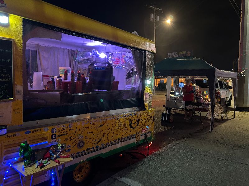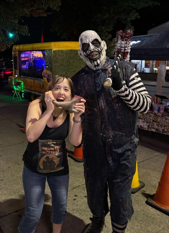 A “NO VACANCY” sign flickered on and off out front as I approached, creating the illusion that this looming red building was an actual hotel I would soon be checking into. When I made my way to the side of the building where the ticket booth was, I was delighted to see that the area had received an overhaul and now included a detailed photo op with props groups could take photos with, like a bellhop cap and a giant key. While I waited in line, I spotted two roamers: a tall (and toothy) black and white clown named Void, and the beautiful Amethyst, who carried a mouth full of blood she was happy to share… I ended up with it running down my arms and smeared on my face at the front door. Two vendors were on site selling various flavors of lemon shake-ups, hot and cold snacks, drinks, and sweets.