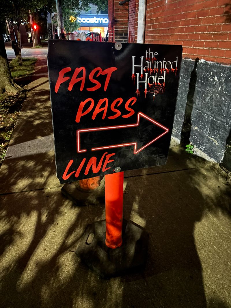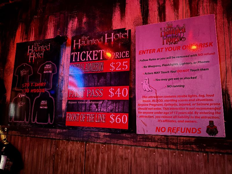 Between the big, easy-to-read sign and ominous red light washing over the building, The Haunted Hotel was easy to spot as I drove up. Tickets could be purchased online or at a booth on the right side of the building. The price for tickets varies depending on the night you visit, with prices increasing later on when the season is in full swing and the haunt is much busier. When I was there, General Admission was $25.00. A speedier Fast Pass upgrade could be added for an extra $15.00, or you could even head straight to the Front of the Line for another $35.00. Free street parking and cash lot parking were available.