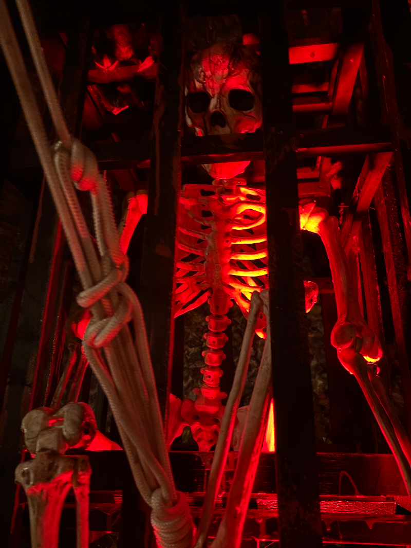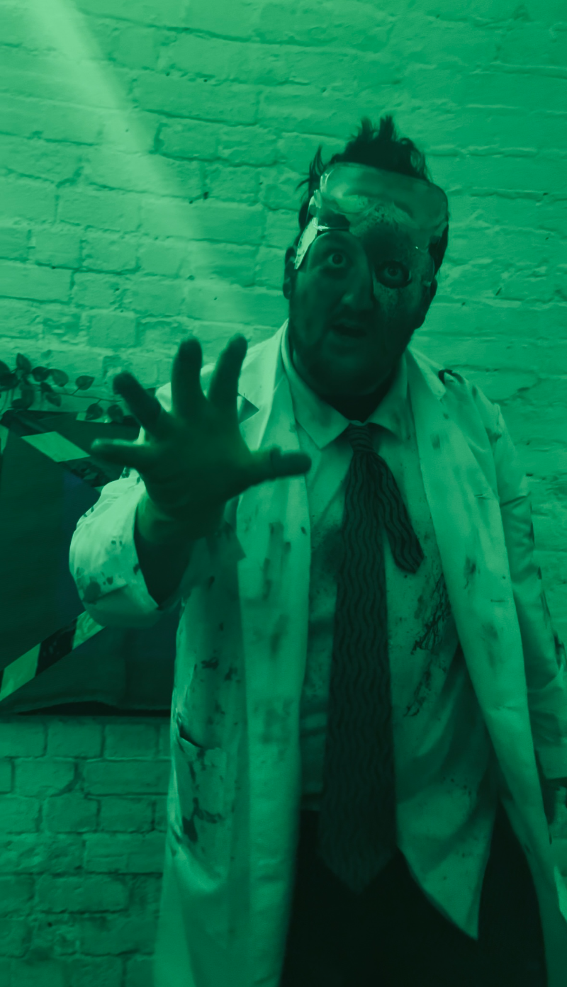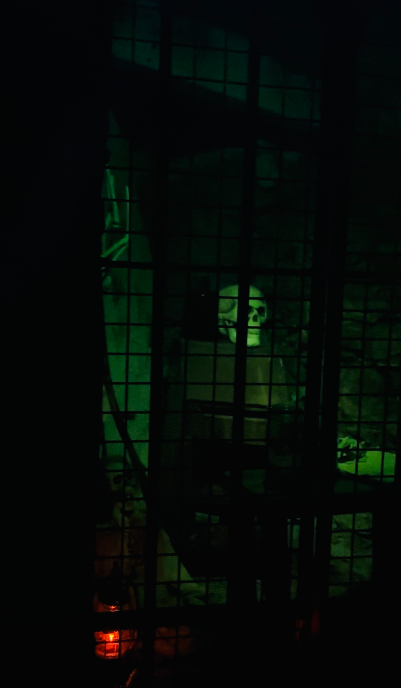 The costumes reflected this haunted cavern’s storyline of a deranged professor conducting unnatural experiments in the depths of these historic caves. Performers in white lab overcoats, some streaked with ominous blood splatter, evoked the feeling of an abandoned scientific outpost gone wrong. Others wore ragged garments that suggested half-finished transmogrifications with colours mixing with the dimness surrounding them. The Raven was particularly unforgettable. They had a mask of layered feathers and elongated claws that clicked along the limestone walls as they moved through the underground passages. The Rabbit and the Goat-Skull figure were also distinctive, their masks realistic and almost alive. While the dim lighting obscured the full scope of the costume and makeup designs, they were coordinated with the environment, making each character feel like they really belonged in these caves.