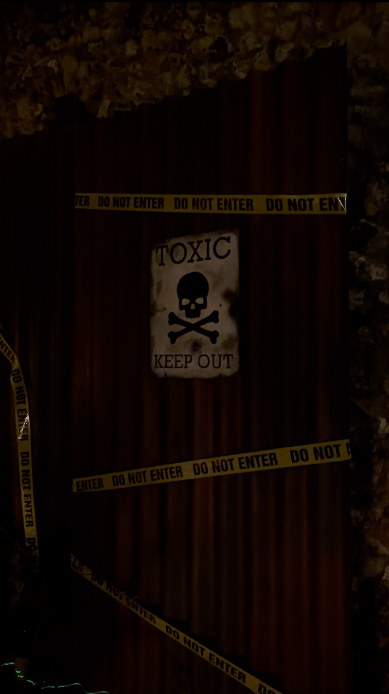 Scenic design itself was quite minimal compared to previous years, but did include caverns with toxic waste barrels, skeletons, and a spiderweb chamber with enormous spiders having taken up residence there. In another chamber, scientist dummies wore gas-masks and appeared from the dark as slow strobing lights revealed the space. This effect was used throughout the tunnels this year, which created moments of almost total darkness, which was a new perspective on them, as usually there is ambient lighting throughout.