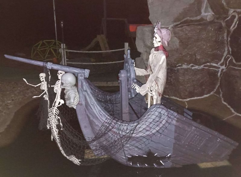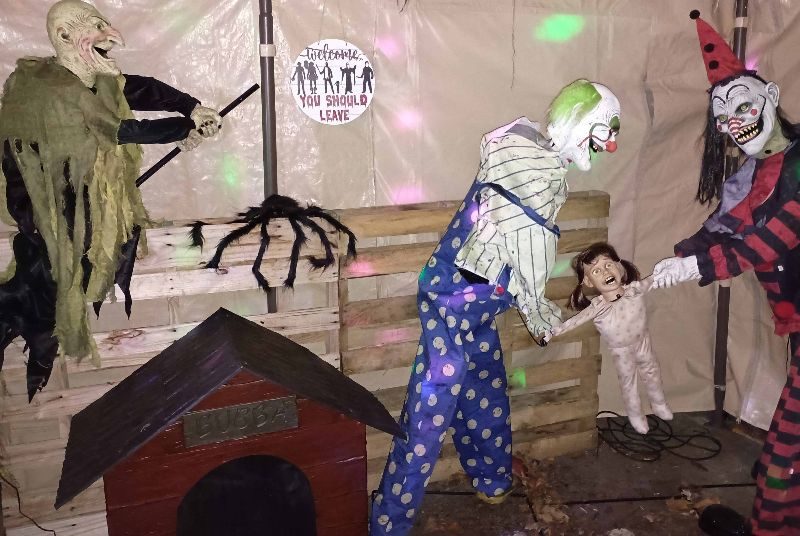 The outstanding witch set featured a cauldron, shelves of potions, and carved wooden symbols hanging down. A playground with miniature equipment like tiny swings looked downright creepy. The butchery maze toward the end was well done and spooky, with alternating dark areas and hallways with lighting effects like a rotating red police siren.
