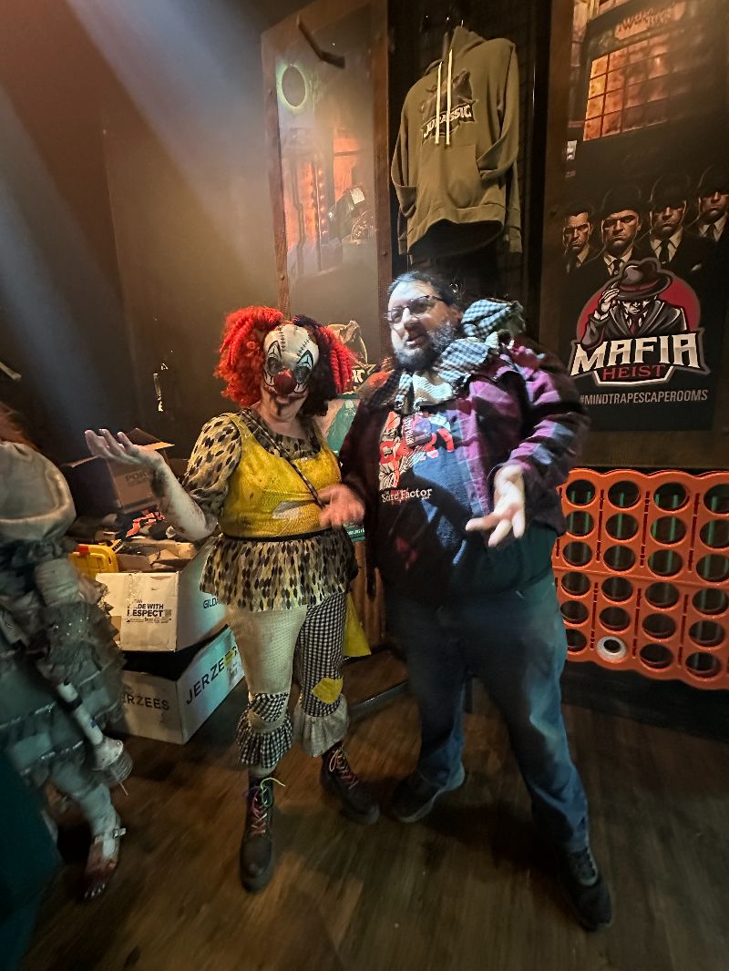 The clowns in the 3D house wanted to talk clown business while they handed us 3D glasses and painted our faces. They provided fun interactions regarding classic clown stuff and cowboys, a great combination. Inside the 3-D clown room, we had fun interactions. The actor on the bungee cord managed to scare us. Most actors tend to pop back right away from the bungee. This actor stayed leaning over us while mocking us.