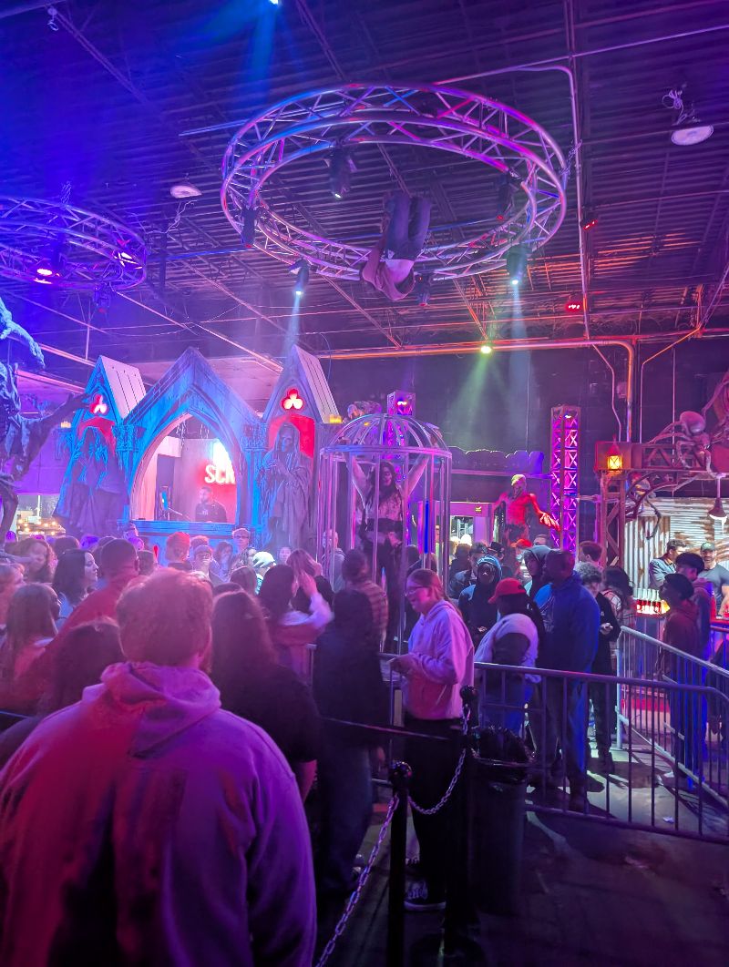 Massacre’s prehaunt experience is off the Richter scale! A bar is stationed right after the security checkpoint inside, giving customers the option to fuel up with some liquid courage. The DJ spins party anthems that remind me of my crazy antics in my early 20s. The DJ booth was introduced last season and is a literal work of art. I have joked earlier this year that this place needs caged dancers, like another well-known haunted house in the Midwest… This comment was taken seriously, and the team at Massacre built one for their queue this season! While music was setting the mood, they placed an actor in the cage to dance like in a nightclub setting. 💃🏼