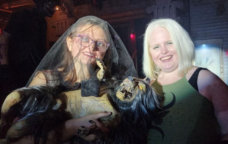 Actors of the midway immediately surrounded us in stalker form as we walked toward the first haunt. They made it clear they were in no hurry to let us get to the first attraction. There, we met Lizea with her hellhound baby, Hubrick. She asked if we would like to pet him. Fortunately, Hubrick’s hellhound teeth haven’t grown out yet!
