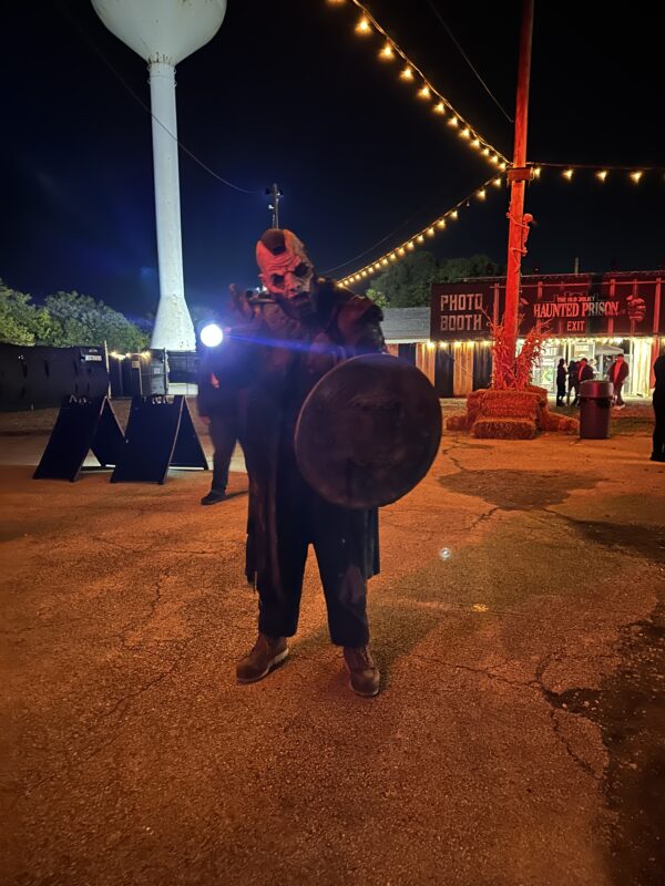 The queue line was run by two well-known actors: String Cheese and The Warden. String Cheese opted for a warmer option of a distressed straight jacket and makeup that looked like scratches all over the face. The Warden loses the helmet to show his new haircut and new metal shoulder pads, making him look more dominant.