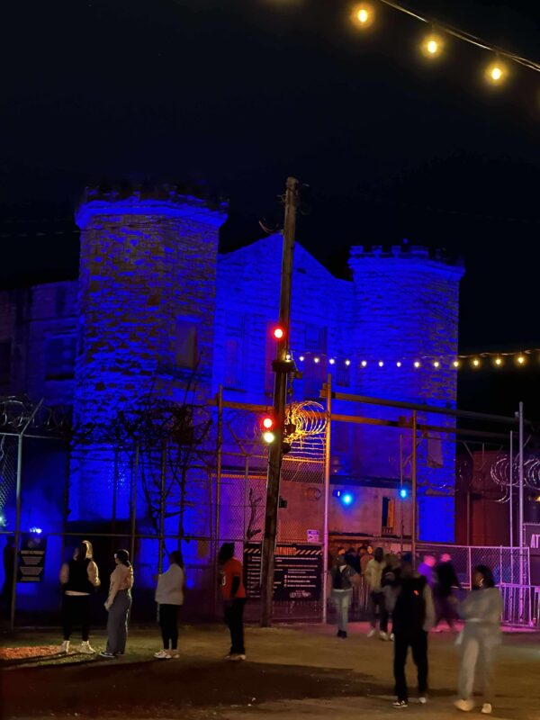 As we are visitors to the prison, undergoing a metal detector search is a great start. The high fence with barbed wire is an authentic touch to this one and only haunted prison. A staff member informs us not to wander or close the doors because they do not have all the keys, which I’d imagine is true since I’d imagine making copies of two maximum security doors are easily accessible. The queue line is positioned next to the prison building, with the watch tower in sight and search lights looming over us.
