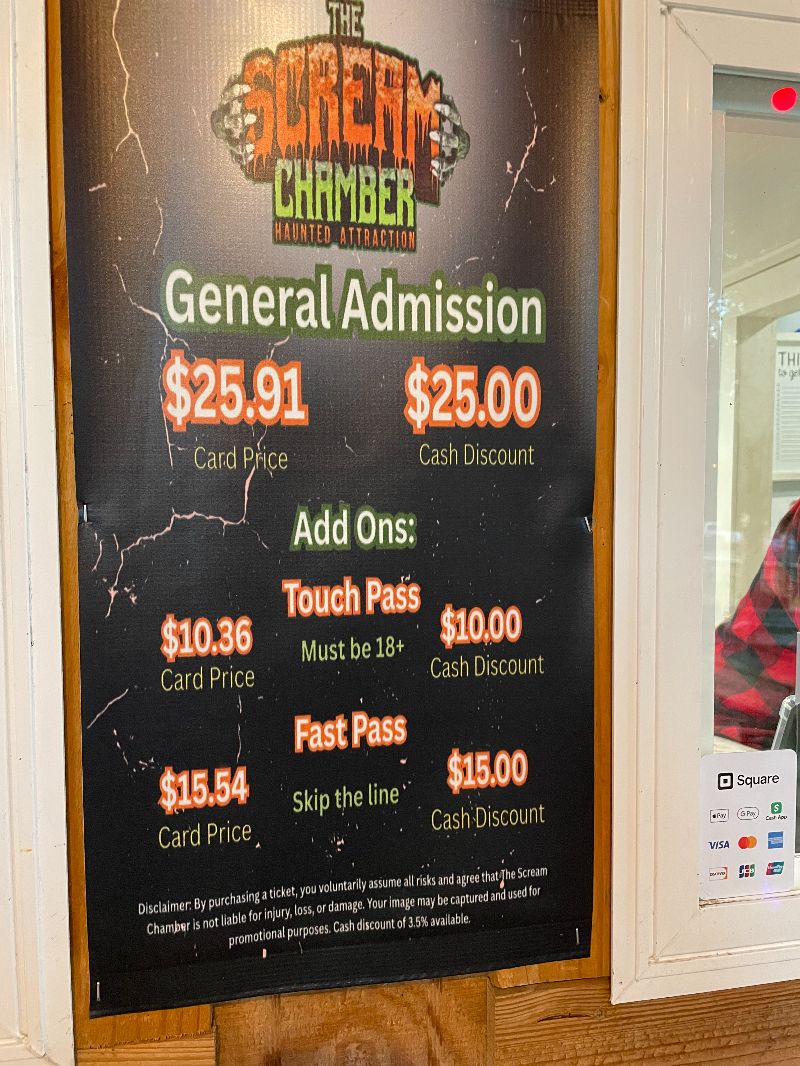 This attraction is easy to locate because of all the lights and signs. We put “The Scream Chamber” into our GPS, and it took us right to it. Once we pulled in, a parking attendant stopped us. She gave us a quick rundown of the rules and directed us to the next parking attendant. When we were parked, it was easy to see where the entrance was.